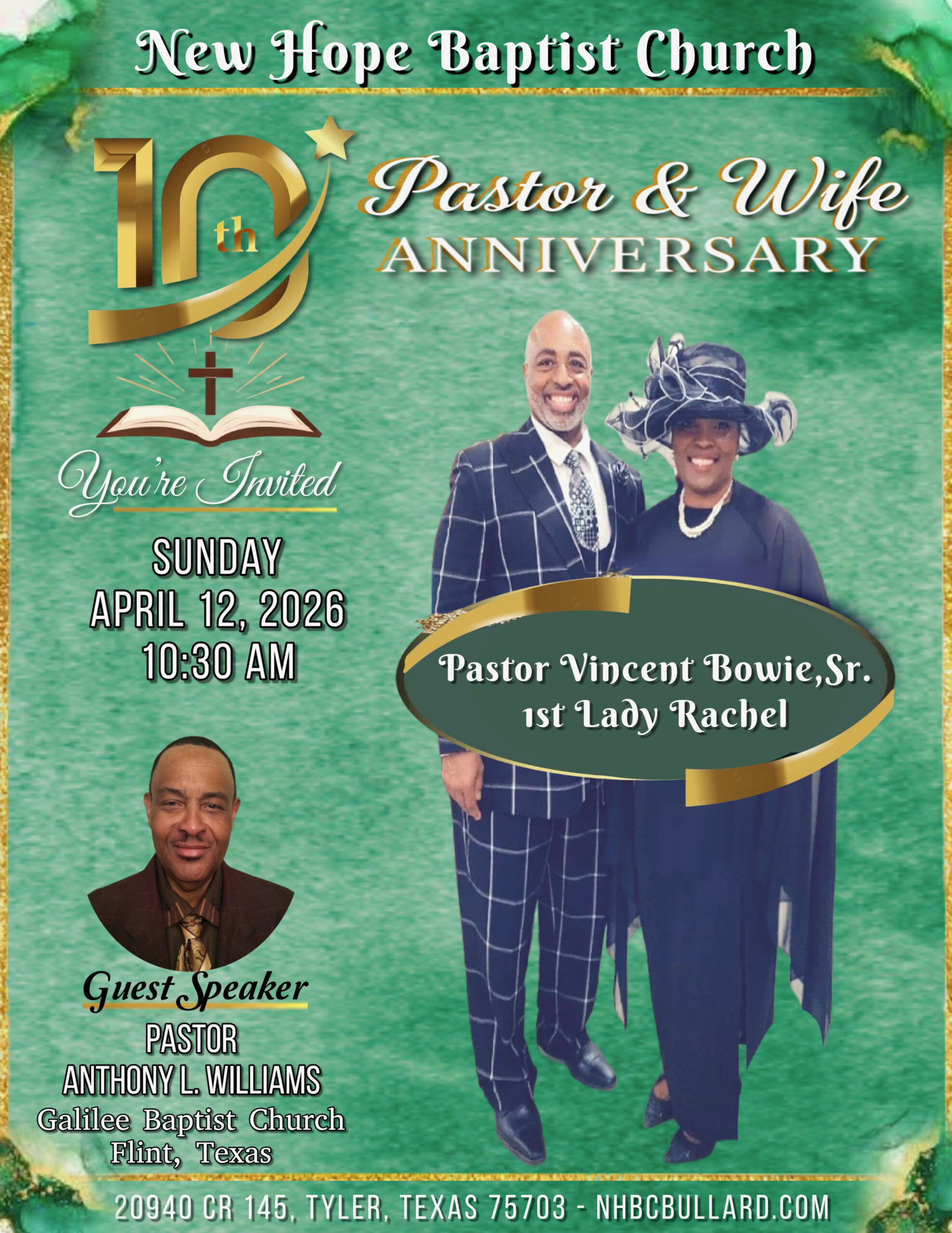 Galilee Baptist Church is honored to support and fellowship with New Hope Baptist Church as they celebrate their 10th Pastor and Wife Anniversary for Pastor Vincent Bowie, Sr. and First Lady Rachel.
