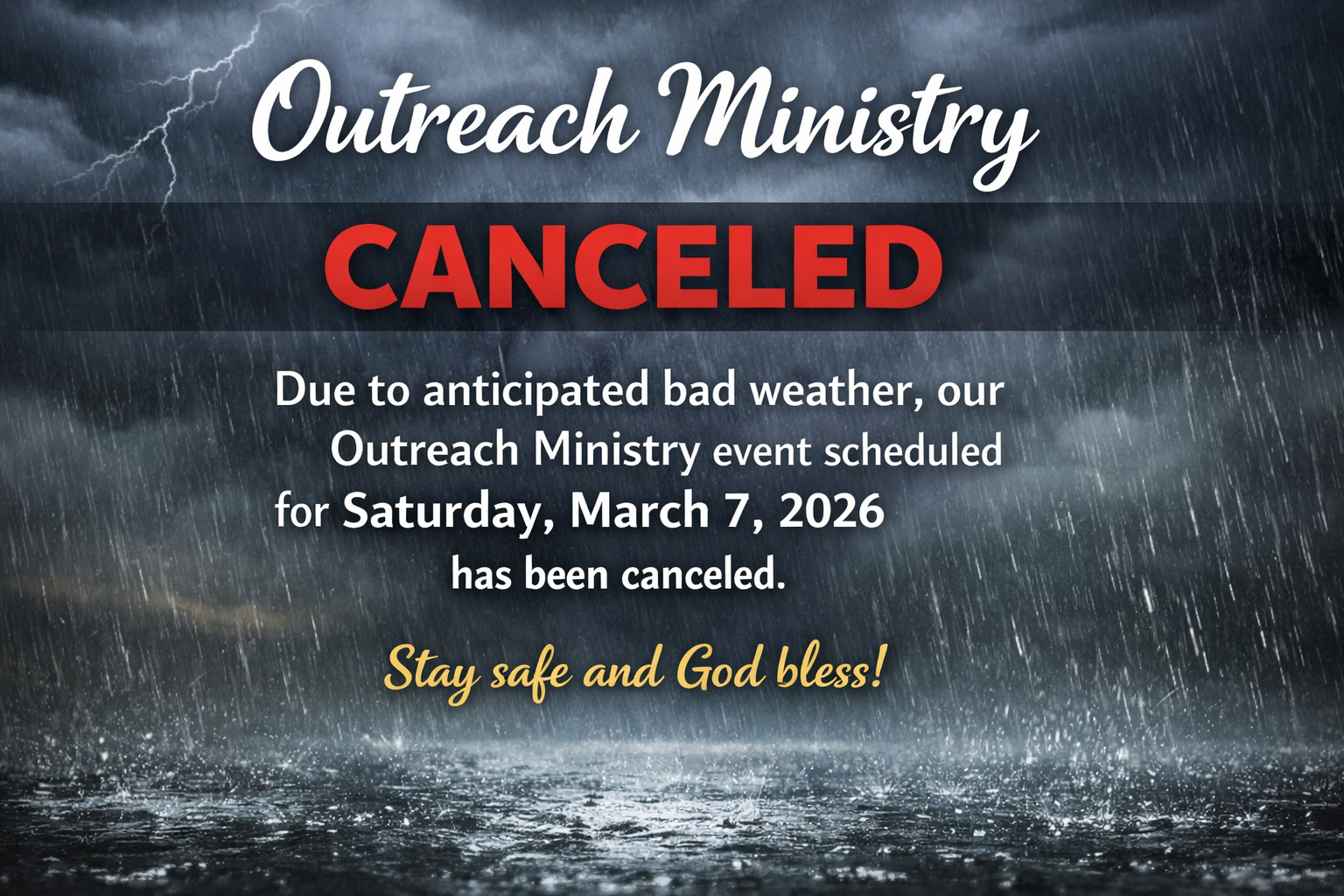 Due to anticipated severe weather in our area, the Outreach Ministry scheduled for Saturday, March 7, 2026 has been canceled.